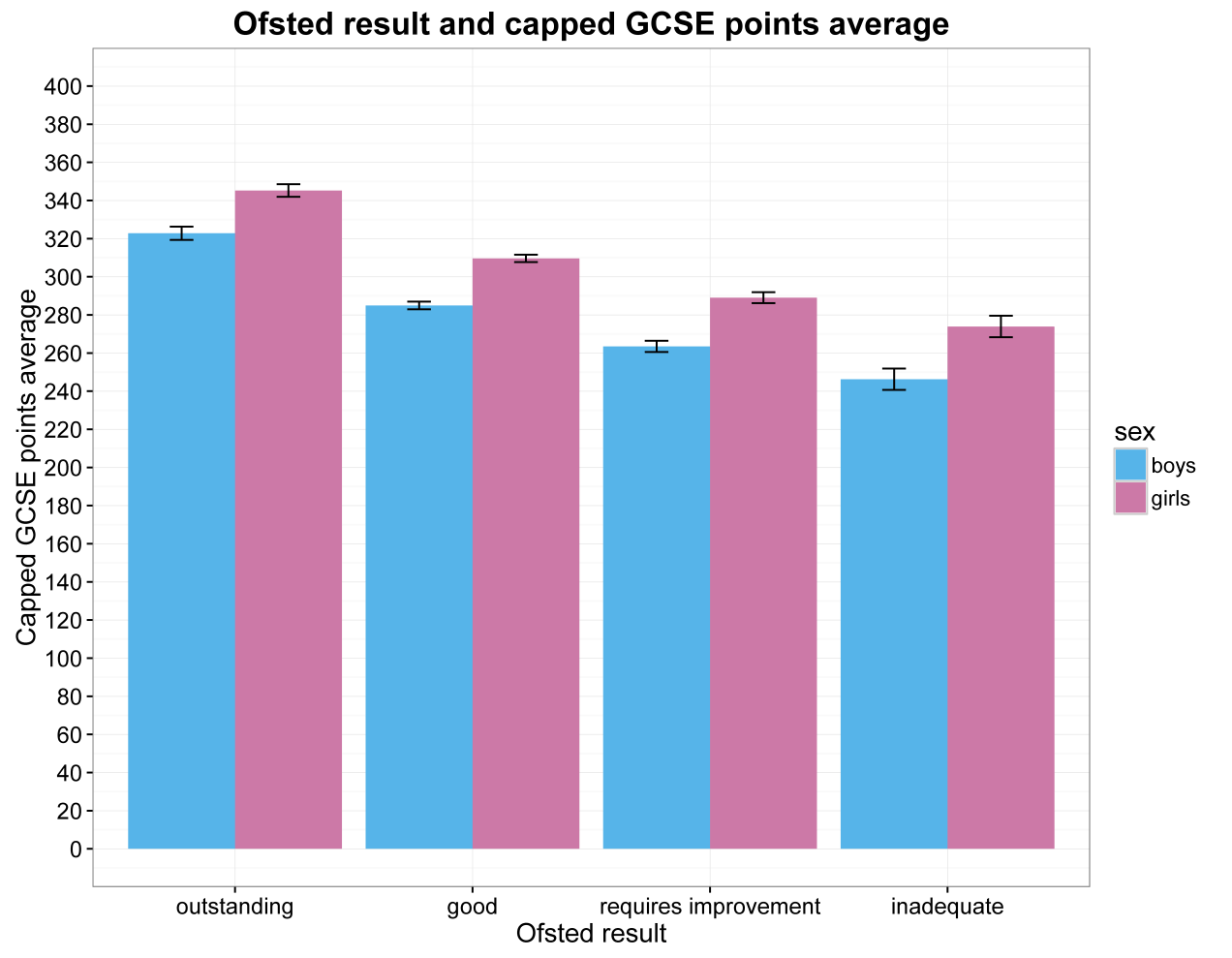 Trackbacks are closed, but you can post a comment. histogram of GCSE capped points score and each sex per ofsted rating