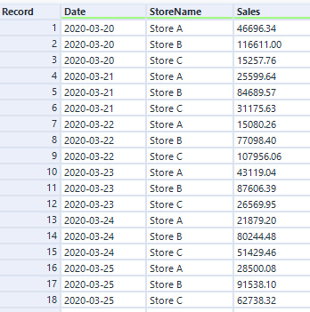 Luckily, I can use the same trick to automatically create a different file for each store by generating a different file name and saving them all within one output tool. Let’s say I’ve got a data set like this:
