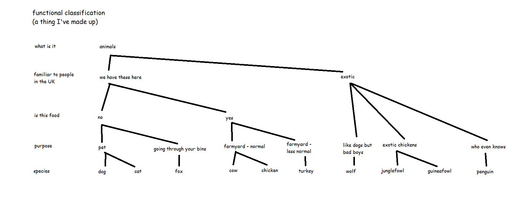 But now, let’s say you run a pet shop, or a zoo. You know your taxonomic classification perfectly, but you also know that selling dogs and wolves in a pet shop is a terrible idea, because while dogs and wolves are technically very similar, one of them is very much not a pet. Or you’re planning out which animals to keep together in which bits of the zoo, and while cows and chickens are nothing like each other on the taxonomic classification, they’re both farmyard animals (and they won’t eat each other), so it would probably make sense to keep cows and chickens together in the “life on the farm” section of the zoo rather than having cows and lions in the “but they’re both mammals, it’ll all be fine” section of the zoo.