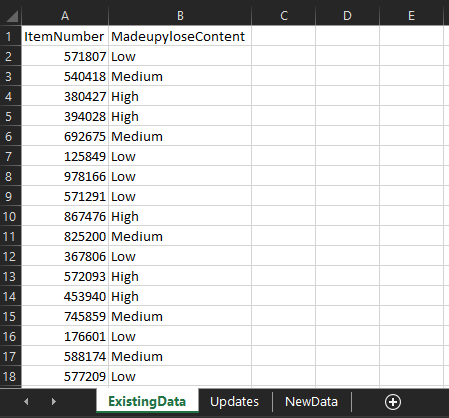 I’ll copy/paste columns A and B for these items into the NewData tab. Then, I’ll copy/paste columns A and B for all items in the Updates tab into the NewData tab underneath (and remember to remove the headers!). Now, I’ve got the full information in one place: