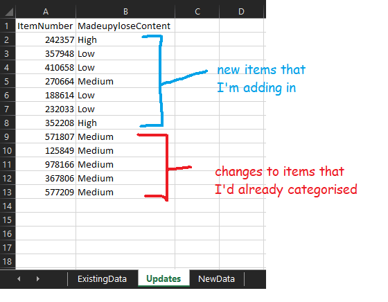 Once I’m happy with my updates, I now need to add them to the production file somehow. I could potentially just open the file and add them in… but that would involve opening the file, for a start, and maybe disrupting another process. And it’s not just a case of adding them in – I could simply copy/paste the new items, but I’d have to find the already-categorised items and have to change them, which would be quite easy to make a mistake on (and I really don’t want to hit CTRL+F a load of times).