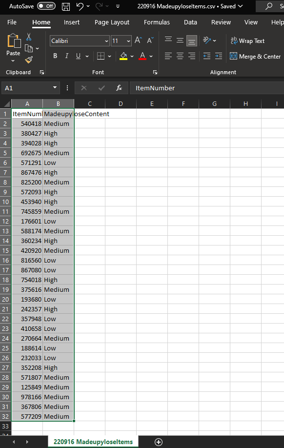 We’re now ready to update the production file. I prefer to take an extra step to create a whole new csv and never actually touch the production file. So, I’m going to take everything in the NewData tab, copy/paste it into a new file, and save that as a csv called “220916 MadeupyloseItems.csv” in the _archive folder: