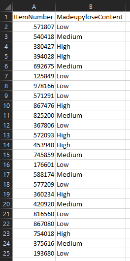 We’ve got a production file called MadeupyloseItems.csv which stores the data, and it looks like this: