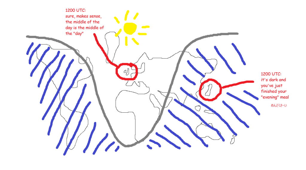 So, each country (or each region of big wide countries) chooses what they want the time to be in that country, based on what makes sense for daylight in that country. Luckily, everybody around the world is pretty much in agreement that you generally want “midday” i.e. 1200 to be around the time that the sun is at its highest point and you want the date to change from Tuesday to Wednesday overnight.