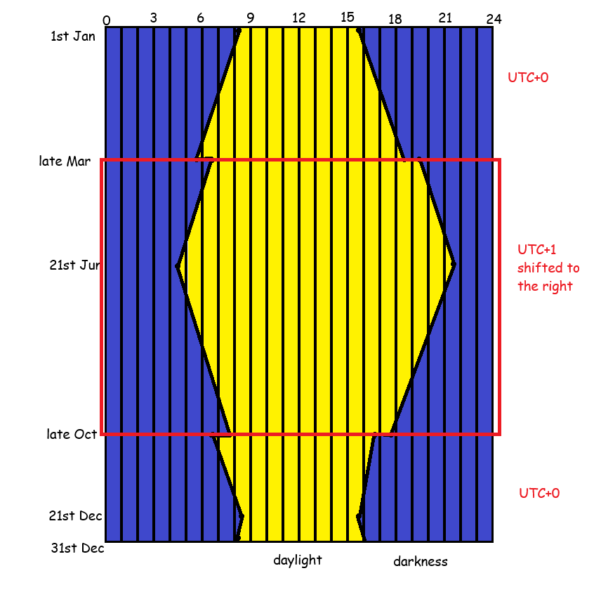 If we ran everything off UTC, then “midday” in the UK would be grand, but “midday” in Japan would be a few hours after the sun has set. Also, “midnight”, when the date changes, would be around when people are starting work or school. You’d get on the school bus on Tuesday at 2315, get to school, and start Maths at “midnight” on Wednesday. Not a great way to run things. This very much not-to-scale diagram shows what that’s like during the northern hemisphere summer: