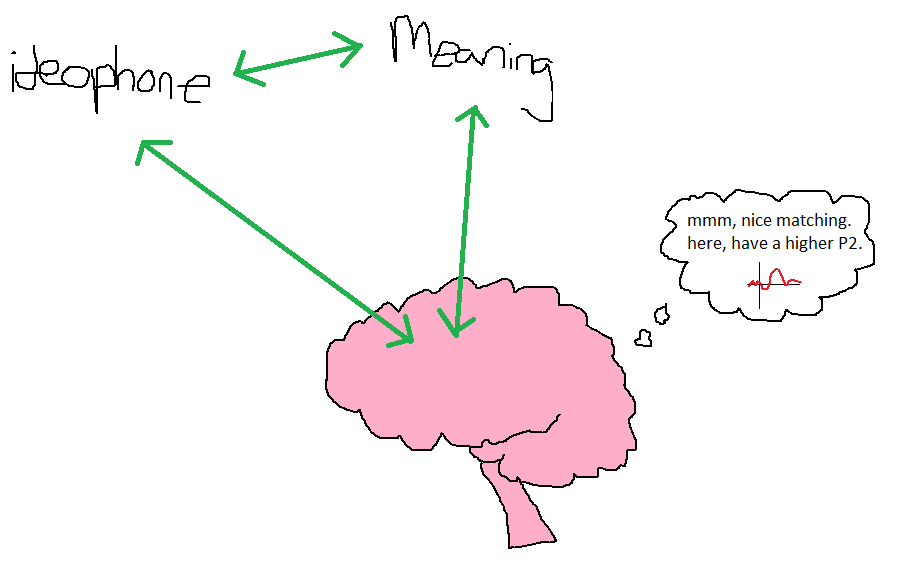 As for the late positive complex, it’s hard to say. It could be that the cross-modal matching of sound and meaning in ideophones actually makes it harder for the brain to work out the ideophone’s role in a sentence because it has to do all the cross-modal sensory processing on top of all the grammatical stuff it’s doing in the first place. It’s very much up for discussion.